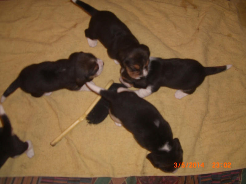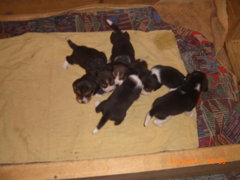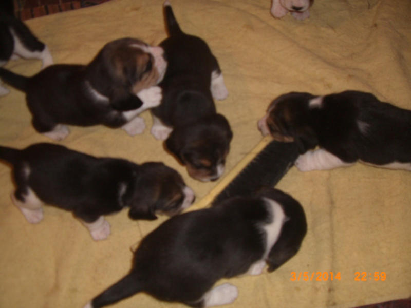 Unser Wurf N2 vom 12.04.2014Tricolour Beagle Welpen werden scharz / weiß geboren, die braune Farbe kommt erst später. Vater: CH Glossy Gambler von der Thurnmühle Mutter: Highlight von Amade AustriaWelpen: 3 Rüden 4 Hündinnen